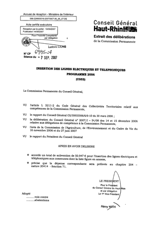 Les communes dont la liste figure en annexe au présent rapport ont sollicité une aide financière départementale pour leurs projets d’insertion de lignes électriques et téléphoniques au titre des programmes 2006 et 2007. Leur éligibilité a été examinée lors des réunions des 13 novembre 2006 et 6 juin 2007 de la commission de programmation de travaux puis validée les 16 novembre 2006 et 27 juin 2007 par la commission de l’agriculture, de l’environnement et du cadre de vie. Conformément à la convention départementale de partenariat, signée le 9 juin 2006 entre le Département du Haut-Rhin, Electricité de France et France Télécom, le total des subventions de la part du Département s’élèverait à 50.947 €.