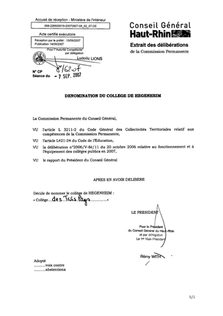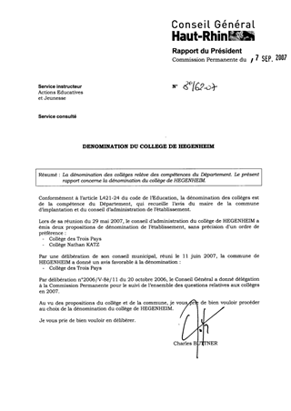 La dénomination des collèges relève des compétences du Département. Le présent rapport concerne la dénomination du collège de HEGENHEIM.