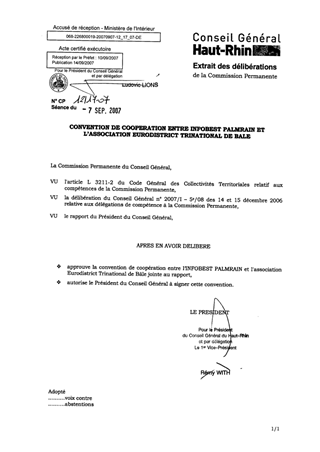 Convention de coopération entre l'Infobest Palmrain et l'association Eurodistrict Trinational de Bâle Resumé Pièces jointes DELIBERATION RAPPORT Assemblée : Commission Permanente Date : 07/09/2007 Rapporteur : Non défini Collectivité : Conseil départemental du Haut-Rhin Direction : Non défini Service : Service de l'Action Internationale, Transfrontalière et Européenne Domaine : Culture Commission : Commission Permanente