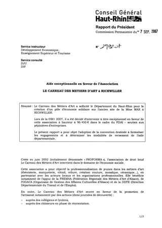 Le Carreau des Métiers d’Art a sollicité le Département du Haut Rhin pour la création d’un pôle d’économie solidaire sur l’ancien site de la Mine MAX à RICHWILLER. Lors de la DM1 2007, il a été décidé d’intervenir à titre exceptionnel en faveur de cette association à hauteur à 96 450 € dans le cadre du FDAI – soutien aux pépinières d’entreprises. Le présent rapport a pour objet l’adoption de la convention destinée à formaliser les engagements et à déterminer les modalités de versement de l’aide départementale.