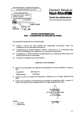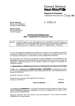 Le présent rapport a pour objet d'approuver les acquisitions de terrains liées aux opérations de la voirie départementale. Le montant de ces transactions immobilières s'établit comme suit : Acquisition : 356 358,21 € - Régularisation : 5 693,96 €.