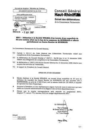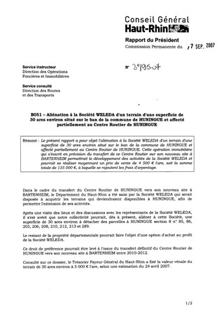 Le présent rapport a pour objet l'aliénation à la Société WELEDA d'un terrain d'une superficie de 30 ares environ situé sur le ban de la commune de HUNINGUE et affecté partiellement au Centre Routier de HUNINGUE. Cette opération immobilière qui s'inscrit en prévision du transfert de ce Centre Routier sur son nouveau site à BARTENHEIM permettrait le développement des activités de la Société WELEDA et pourrait se réaliser moyennant un prix de vente de 4 500 € l'are, soit la somme totale de 135 000 €, à laquelle se rajoutent les frais d'arpentage.