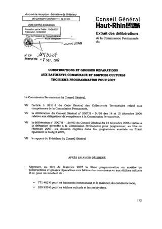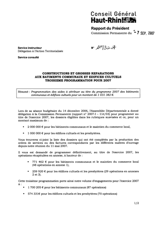 Constructions et grosses réparations aux bâtiments communaux et édifices cultuels : troisième programmation pour 2007