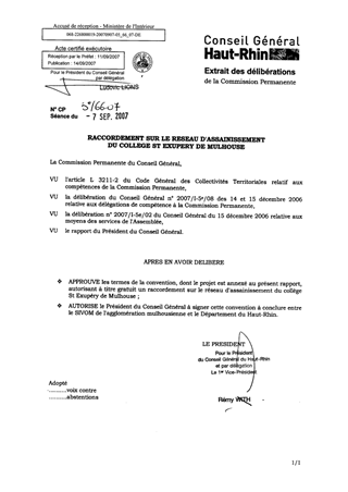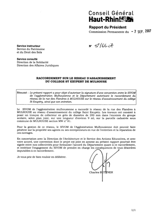 Le présent rapport a pour objet d'autoriser la signature d'une convention entre le SIVOM de l'agglomération Mulhousienne et le Département autorisant le raccordement du réseau de la rue des Flandres à MULHOUSE sur le réseau d'assainissement du collège St Exupéry, ainsi que son entretien.