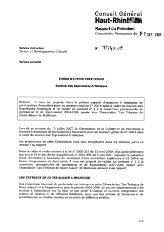 Il vous est proposé, dans le présent rapport d'examiner 8 demandes de participations financières pour un montant total de 67 000 € dans le cadre du Soutien aux Expressions Artistiques et de valider un avenant n° 1 à la convention pluriannuelle de partenariat et de financement 2004-2006 passée avec l'Association "Les Tréteaux de Haute Alsace" de Mulhouse.