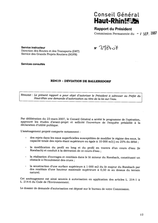 Le présent rapport a pour objet d’autoriser le Président à adresser au Préfet du Haut-Rhin une demande d’autorisation au titre de la loi sur l’eau.