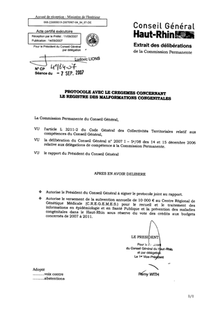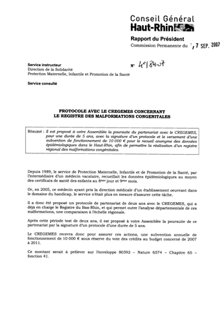 Il est proposé à votre Assemblée la poursuite du partenariat avec le CREGEMES, pour une durée de 5 ans, avec la signature d’un protocole et le versement d’une subvention de fonctionnement de 10 000 € pour le recueil anonyme des données épidémiologiques dans le Haut-Rhin, afin de permettre la réalisation d’un registre régional des malformations congénitales.