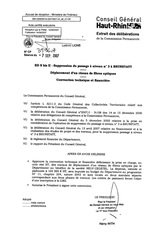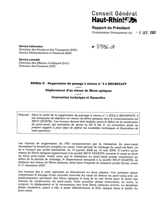 Dans le cadre de la suppression du passage à niveau n° 3 (PN3) à BRUNSTATT, il est nécessaire de déplacer un réseau de fibres optiques dont le concessionnaire est NEUF CEGETEL. Ces travaux doivent être réalisés avant le début de la construction du pont-canal, qui permettra de dévier la RD 8 Bis II. La convention jointe au présent rapport a pour objet de définir les modalités techniques et financières de cette opération.