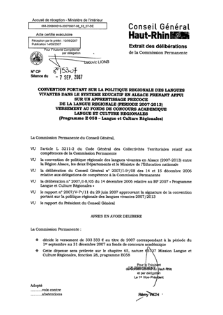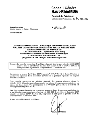 La nouvelle convention de politique régionale des langues vivantes 2007/2013 suppose pour le Département du Haut-Rhin un versement en 2007 de 333 333 € correspondant à la période du 1er septembre au 31 décembre 2007.
