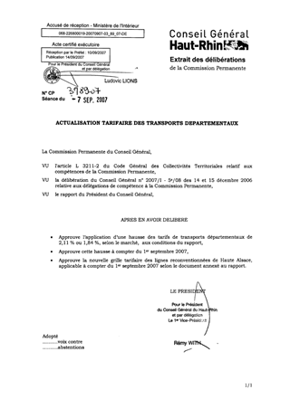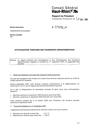 Le rapport présente pour homologation le taux d’actualisation des transports départementaux réguliers et scolaires au 1er septembre 2007, en application des marchés.