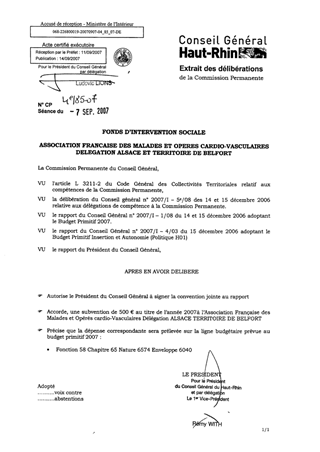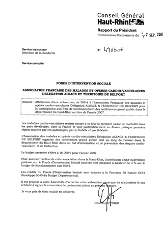 Attribution d’une subvention de 500 € à l’Association Française des malades et opérés cardio-vasculaires Délégation ALSACE & TERRITOIRE DE BELFORT pour la participation aux frais de fonctionnement des conférences grand public dans le département du Haut-Rhin au titre de l’année 2007.