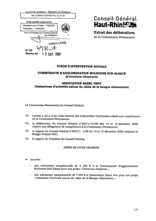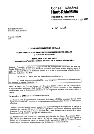 Proposition d'attribution exceptionnelle de participations financières au titre du Fonds d'Intervention Sociale aux structures suivantes pour leurs actions inscrites dans le cadre du Contrat Urbain de Cohésion Sociale (CUCS) de la Communauté d’Agglomération Mulhouse Sud Alsace (CAMSA) : - 4 500 € à la CAMSA pour son projet « l'Aventure citoyenne », - 7 000 € à l’Association Sahel Vert pour son projet « Animations d’activités autour du relais de la Banque Alimentaire ».