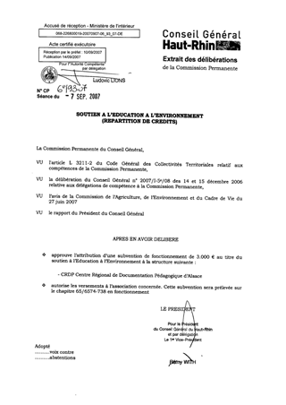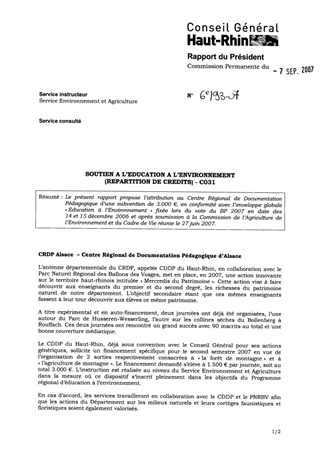 Le présent rapport propose l’attribution au Centre Régional de Documentation Pédagogique d’une subvention de 3.000 €, en conformité avec l’enveloppe globale « Education à l’Environnement » fixée lors du vote du BP 2007 en date des 14 et 15 décembre 2006 et après soumission à la Commission de l’Agriculture de l’Environnement et du Cadre de Vie réunie le 27 juin 2007.