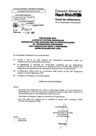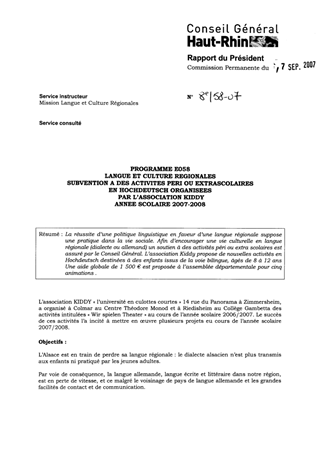 Programme E058 : Langue et Culture Régionales : Subvention à des activités péri ou extrascolaires en Hochdeutsch organisées par l'Association Kiddy - Année scolaire 2007-2008