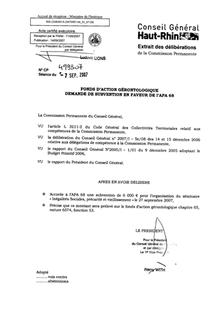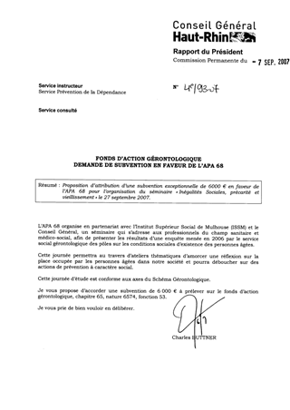Proposition d’attribution d’une subvention exceptionnelle de 6000 € en faveur de l’APA 68 pour l’organisation du séminaire « Inégalités Sociales, précarité et vieillissement » le 27 septembre 2007.