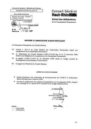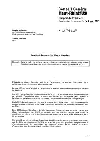 Dans le cadre du présent rapport, il est proposé d’allouer à l’Association Alsace Biovalley une subvention de fonctionnement de 12 000 € pour l’année 2007.