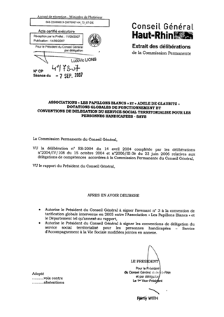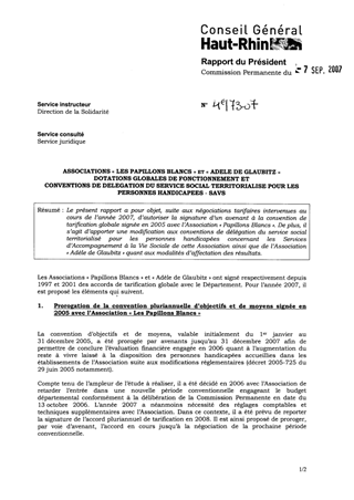Le présent rapport a pour objet, suite aux négociations tarifaires intervenues au cours de l’année 2007, d’autoriser la signature d’un avenant à la convention de tarification globale signée en 2005 avec l’Association « Papillons Blancs ». De plus, il s’agit d’apporter une modification aux conventions de délégation du service social territorialisé pour les personnes handicapées concernant les Services d’Accompagnement à la Vie Sociale de cette Association ainsi que de l’Association « Adèle de Glaubitz » quant aux modalités d’affectation des résultats.