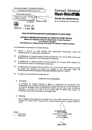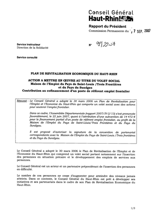 Le Conseil Général a adopté le 30 mars 2006 un Plan de Revitalisation pour l’Emploi et l’Economie du Haut-Rhin qui comporte un volet social avec des actions pour soutenir l’emploi frontalier. Dans ce cadre, l’Assemblée Départementale (rapport 2007/IV-2/13) s’est prononcée favorablement, le 22 juin 2007, quant à l’attribution d’une subvention de 14 472 € pour le financement partiel d’un poste de réfèrent emploi frontalier, au profit de la Maison de l’Emploi du Pays de Saint-Louis/Trois Frontières et du Pays du Sundgau. Il est proposé d’autoriser la signature de la convention de partenariat correspondante avec la Maison de l’Emploi du Pays de Saint-Louis /Trois frontières et du Pays du Sundgau.