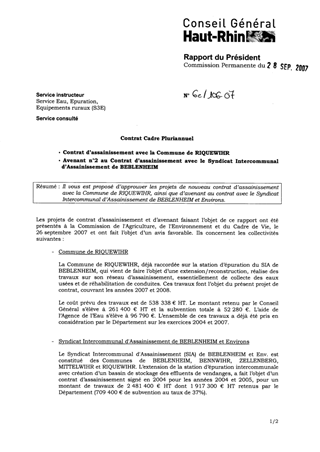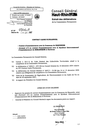 Il vous est proposé d’approuver les projets de nouveau contrat d’assainissement avec la Commune de RIQUEWIHR, ainsi que d’avenant au contrat avec le Syndicat Intercommunal d’Assainissement de BEBLENHEIM et Environs.