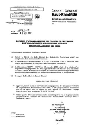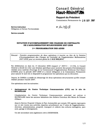 Première programmation de deux opérations à inscrire au titre de la Dotation d’Accompagnement des Charges de Centralité de l’Agglomération Mulhousienne 2007-2008, pour un montant global de 1 612 950,00 €.