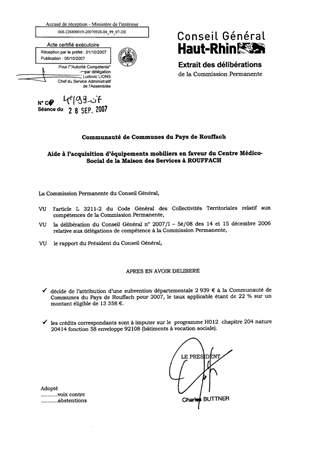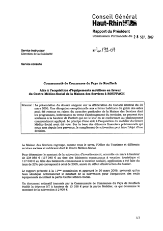 Communauté de Communes du Pays de ROUFFACH. Aide à l'acquisition d'équipements mobiliers en faveur du centre médico-social de la Maison des services à ROUFFACH