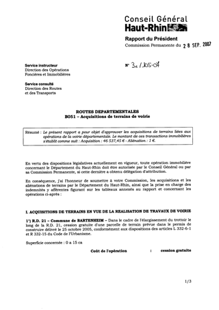 Le présent rapport a pour objet d'approuver les acquisitions de terrains liées aux opérations de la voirie départementale. Le montant de ces transactions immobilières s'établit comme suit : Acquisition : 46 537,45 € - Aliénation : 1 €.