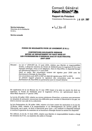 La Loi n° 2004-809 du 13 août 2004, relative aux libertés et responsabilités locales, a élargi les missions du Fonds de Solidarité pour le Logement (F.S.L.) aux impayés d’énergie, d’eau et de téléphone. Dans le Haut-Rhin, le dispositif énergie est opérationnel depuis le 1er avril 2006. Dans ce cadre, des conventions avaient été signées pour 2006 avec les fournisseurs d’énergie du Haut-Rhin. Les conventions avec EDF et GDF ont déjà été signées pour 2007 à 2009. Le présent rapport propose la signature des conventions avec les autres fournisseurs du Haut-Rhin en partenariat avec le Conseil Général.