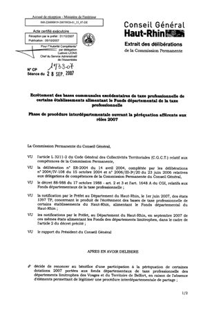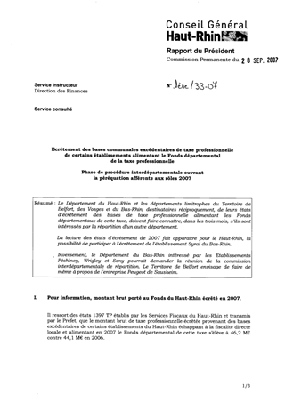 Le Département du Haut-Rhin et les départements limitrophes du Territoire de Belfort, des Vosges et du Bas-Rhin, destinataires réciproquement, de leurs états d’écrêtement des bases de taxe professionnelle alimentant les Fonds départementaux de cette taxe, doivent faire connaître, dans les trois mois, s’ils sont intéressés par la répartition d’un autre département. La lecture des états d'écrêtement de 2007 fait apparaître pour le Haut-Rhin, la possibilité de participer à l'écrêtement de l'établissement Syral du Bas-Rhin. Inversement, le Département du Bas-Rhin intéressé par les Etablissements Péchiney, Wrigley et Sony pourrait demander la réunion de la commission interdépartementale de répartition. Le Territoire de Belfort envisage de faire de même à propos de l'entreprise Peugeot de Sausheim.