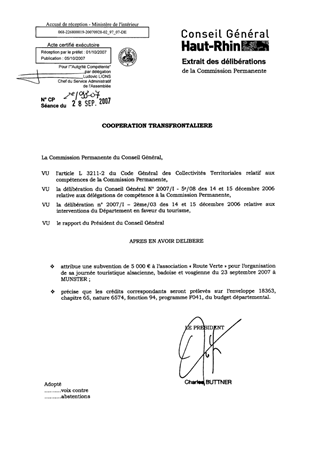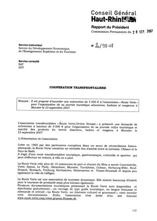 Il est proposé d’accorder une subvention de 5 000 € à l’association « Route Verte » pour l’organisation de sa journée touristique alsacienne, badoise et vosgienne à Munster le 23 septembre 2007.