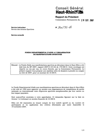 Le Fonds d’aide aux manifestations sportives se déroulant dans le Haut-Rhin a été doté lors du BP 2007, rapport 2007/I-10e/02 de 170 000 €. Cette enveloppe est répartie au cas par cas, en cours d’année, par la Commission Permanente. Le présent rapport vous propose une septième série de dossiers à prendre en compte au titre de 2007, pour un montant de 16 000 €.