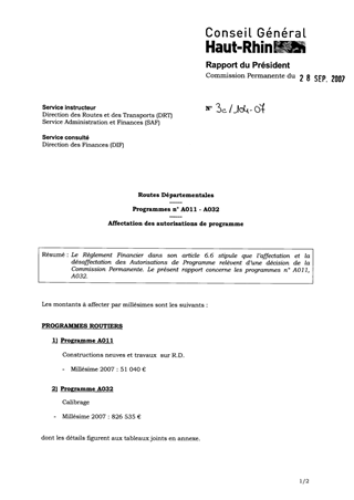 Le Règlement Financier dans son article 6.6 stipule que l’affectation et la désaffectation des Autorisations de Programme relèvent d’une décision de la Commission Permanente. Le présent rapport concerne les programmes n° A011, A032.