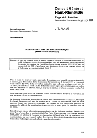 il vous est proposé, dans le présent rapport d’une part, d'autoriser le versement du solde de la participation du Conseil Général pour les bourses aux élèves fréquentant les écoles de musique du Haut-Rhin durant l'année scolaire 2006/2007 pour un montant de 88 000 € et d'autre part, l'émission de titres de recettes auprès de 2 écoles pour un montant total de 1 550 €.