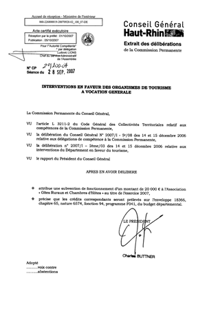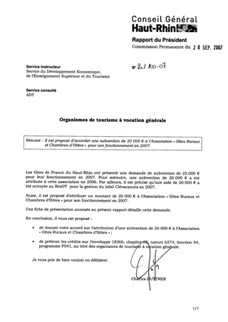 Il est proposé d’accorder une subvention de 20 000 € à l’Association « Gîtes Ruraux et Chambres d’Hôtes » pour son fonctionnement en 2007.