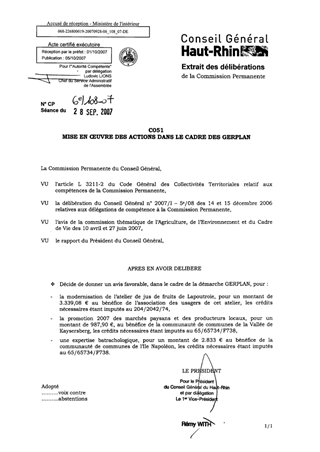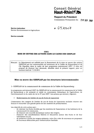 Le Département est sollicité pour le financement de la mise en œuvre des actions GERPLAN par les communautés de communes de la Vallée de Kaysersberg et de l’Ile Napoléon dans le cadre de leur programme prévisionnel 2007. Il vous est proposé de financer leur demande, détaillée dans le présent rapport, pour un montant total de 7.159,98 €.