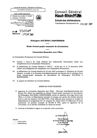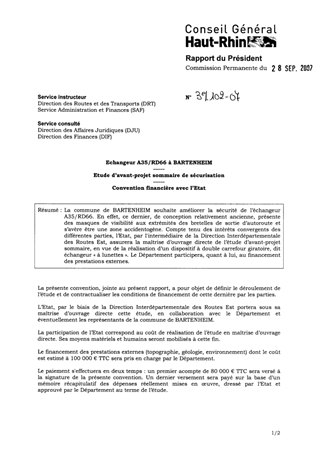 La commune de BARTENHEIM souhaite améliorer la sécurité de l’échangeur A35/RD66. En effet, ce dernier, de conception relativement ancienne, présente des masques de visibilité aux extrémités des bretelles de sortie d’autoroute et s’avère être une zone accidentogène. Compte tenu des intérêts convergents des différentes parties, l’Etat, par l'intermédiaire de la Direction Interdépartementale des Routes Est, assurera la maîtrise d’ouvrage directe de l’étude d’avant-projet sommaire, en vue de la réalisation d’un dispositif à double carrefour giratoire, dit échangeur « à lunettes ». Le Département participera, quant à lui, au financement des prestations externes.