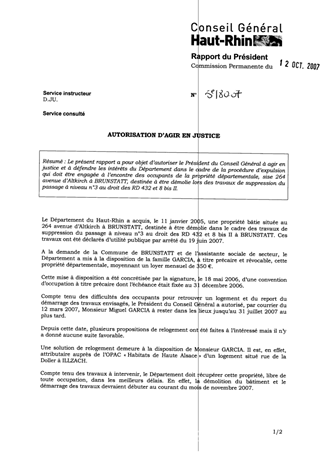 Le présent rapport a pour objet d’autoriser le Président du Conseil Général à agir en justice et à défendre les intérêts du Département dans le cadre de la procédure d’expulsion qui doit être engagée à l’encontre des occupants de la propriété départementale, sise 264 avenue d’Altkirch à BRUNSTATT, destinée à être démolie lors des travaux de suppression du passage à niveau n°3 au droit des RD 432 et 8 bis II.
