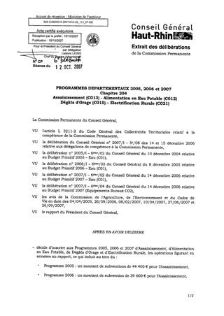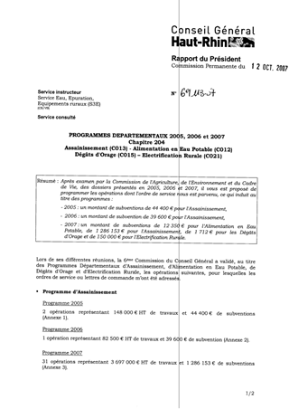 Après examen par la Commission de l'Agriculture, de l'Environnement et du Cadre de Vie, des dossiers présentés en 2005, 2006 et 2007, il vous est proposé de programmer les opérations dont l'ordre de service nous est parvenu, ce qui induit au titre des programmes : - 2005 : un montant de subventions de 44 400 € pour l'Assainissement, - 2006 : un montant de subvention de 39 600 € pour l'Assainissement, - 2007 : un montant de subventions de 12 350 € pour l’Alimentation en Eau Potable, de 1 286 153 € pour l'Assainissement, de 1 712 € pour les Dégâts d'Orage et de 150 000 € pour l'Electrification Rurale.