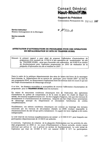 le présent rapport a pour objet de proposer l’affectation d’autorisations de programme d’un montant de 13 050 € à des opérations de revalorisation du site du THANNER HUBEL , ainsi que d’accorder une subvention de 8 000 € en section de fonctionnement pour l’opération programmée en 2005 de réalisation de la plaquette d’information du site et réalisée en 2007.