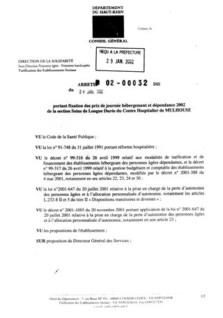 Portant fixation des prix de journée hébergement et dépendance 2002 de la section soins de longue durée du centre hospitalier de MULHOUSE Resumé Pièces jointes ARRETE Assemblée : Non défini Date : 24/01/2002 Rapporteur : Non défini Collectivité : Conseil départemental du Haut-Rhin Direction : Non défini Service : Service de la Tarification des Etablissements Domaine : Prix de Journée Commission :