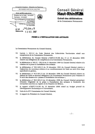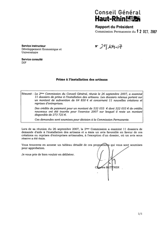 La 2ème Commission du Conseil Général, réunie le 26 septembre 2007, a examiné 11 dossiers de prime à l’installation des artisans. Les dossiers retenus portent sur un montant de subvention de 64 850 € et concernent 11 nouvelles créations et reprises d’entreprises. Des crédits de paiement pour un montant de 532 055 € dont 322 055 € de crédits nouveaux ont été inscrits pour l’exercice 2007 sur lesquel il reste un montant disponible de 273 725 €. Ces demandes sont soumises pour décision à la Commission Permanente.