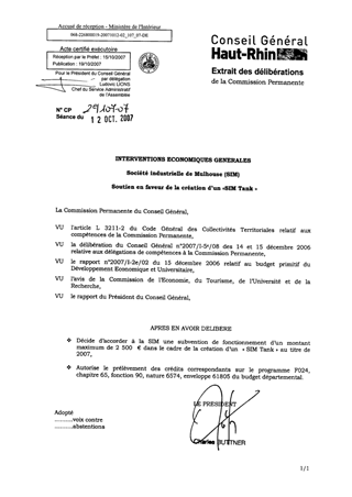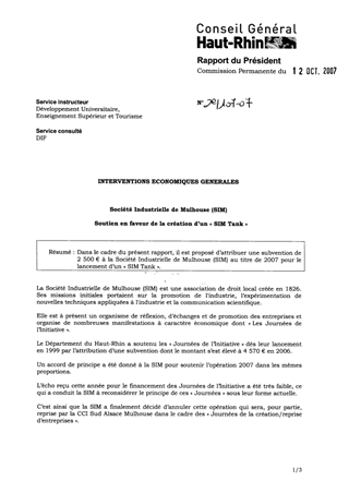 Résumé : Dans le cadre du présent rapport, il est proposé d’attribuer une subvention de 2 500 € à la Société Industrielle de Mulhouse (SIM) au titre de 2007 pour le lancement d’un « SIM Tank ».