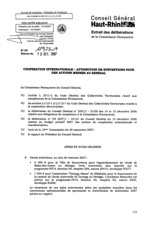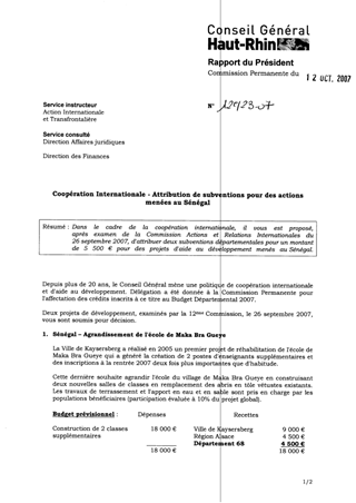Dans le cadre de la coopération internationale, il vous est proposé, après examen de la Commission Actions et Relations Internationales du 26 septembre 2007, d'attribuer deux subventions départementales pour un montant de 5 500 € pour des projets d'aide au développement menés au Sénégal.