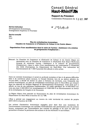 La Chambre de Commerce et d’Industrie de Colmar et du Centre Alsace en partenariat avec la Chambre de Commerce et d’Industrie Sud Alsace Mulhouse propose de réorienter l’action « Assistance à la création de groupements d’employeurs » dans le cadre d’une manifestation qui s’adresserait à l’ensemble des chefs d’entreprises du Département du Haut-Rhin. Une subvention de fonctionnement de 7 300 € pourrait être allouée à cette action.