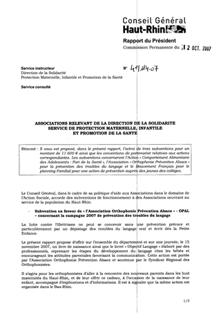 Il vous est proposé, dans le présent rapport, l’octroi de trois subventions pour un montant de 11 600 € ainsi que les conventions de partenariat relatives aux actions correspondantes. Les subventions concerneront l’Action « Comportement Alimentaire des Adolescents : Pari de la Santé », l’Association « Orthophonie Prévention Alsace » pour la prévention des troubles du langage et le Mouvement Français pour le planning Familial pour une action de prévention auprès des jeunes des collèges.