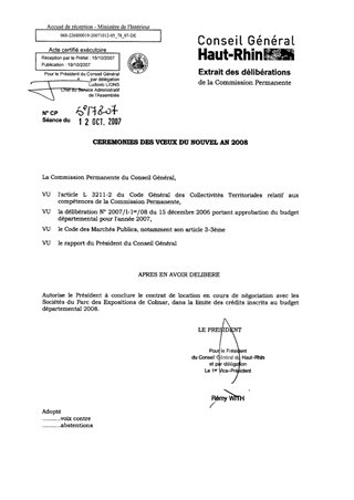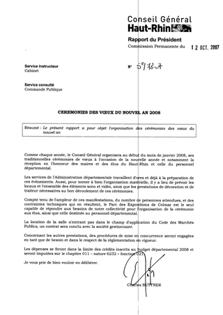 Cérémonies des voeux du Nouvel An 2008. Resumé Le présent rapport a pour objet l'organisation des cérémonies des vœux du nouvel an Pièces jointes DELIBERATION RAPPORT Assemblée : Commission Permanente Date : 12/10/2007 Rapporteur : Non défini Collectivité : Conseil départemental du Haut-Rhin Direction : Non défini Service : Cabinet Domaine : Culture Commission : Commission Permanente