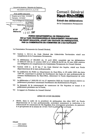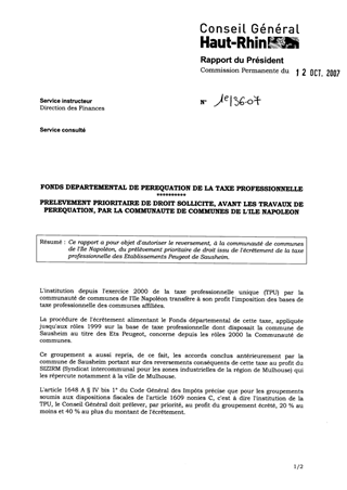 Ce rapport a pour objet d'autoriser le reversement, à la communauté de communes de l'Ile Napoléon, du prélèvement prioritaire de droit issu de l'écrêtement de la taxe professionnelle des Etablissements Peugeot de Sausheim.