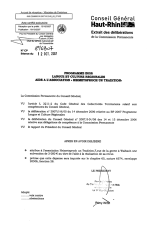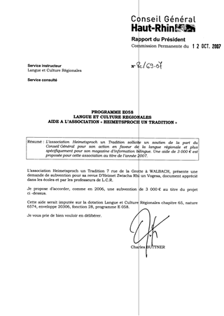 L’association Heimetsproch un Tradition sollicite un soutien de la part du Conseil Général pour son action en faveur de la langue régionale et plus spécifiquement pour son magazine d’information bilingue. Une aide de 3 000 € est proposée pour cette association au titre de l’année 2007.