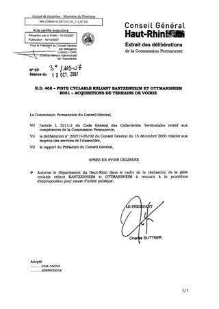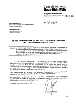 RD 468. Piste cyclable reliant Bantzenheim et Ottmarsheim. B051. Acquisitions de terrains de voirie