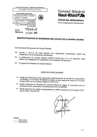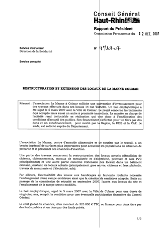 L’association La Manne à Colmar sollicite une subvention d’investissement pour des travaux effectués dans ses locaux 14 rue Wilhelm. Un bail emphytéotique a été signé le 5 mars 2007 avec la Ville de Colmar. Le projet concerne les bâtiments déjà occupés mais aussi un autre à proximité immédiate. La montée en charge de l’activité rend inéluctable sa réalisation qui vise donc à l’amélioration des conditions d’accueil des publics. Son financement s’effectue pour un tiers par des dons et un autofinancement, pour moitié par la Région, la DDE et la CAF. Le solde, est sollicité auprès du Département.