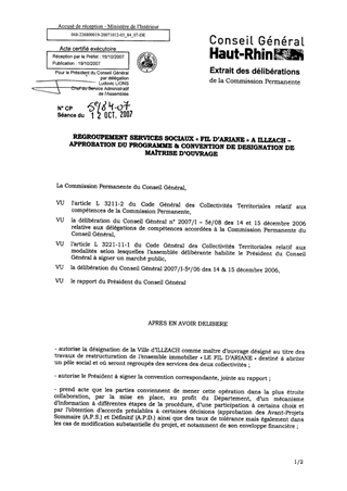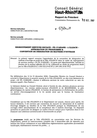 Le présent rapport concerne l’approbation de la convention de désignation de maîtrise d’ouvrage au profit de la Ville d’ILLZACH dans le cadre du regroupement de services sociaux « LE FIL D’ARIANE ». La quote part départementale, calculée en fonction de la surface affectée (22.53 %), s’élèverait au stade du programme établi par la Ville d’ILLZACH à 1 090 632.24 €/HT (1 304 396.16 €/TTC).